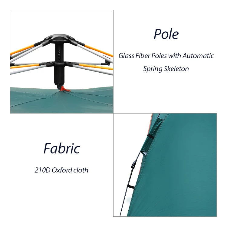 Constructed with durable 210D Oxford PU-coated fabric and supported by a sturdy fiberglass frame, the tent offers excellent waterproof performance and long-lasting stability. Its spacious interior comfortably accommodates 3–4 people, while the two-room structure improves ventilation and privacy.